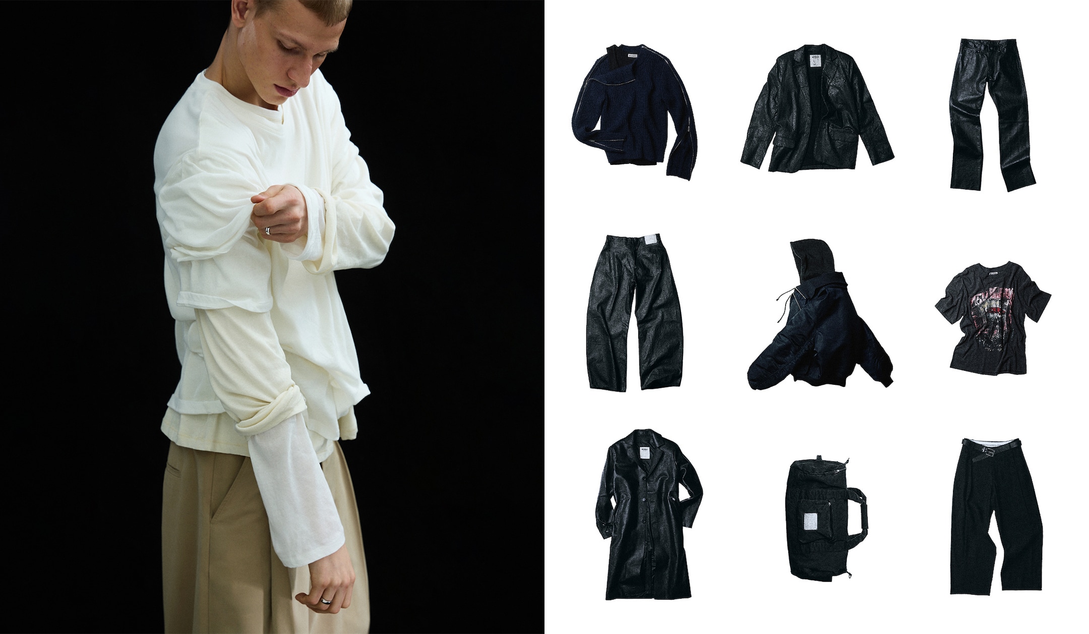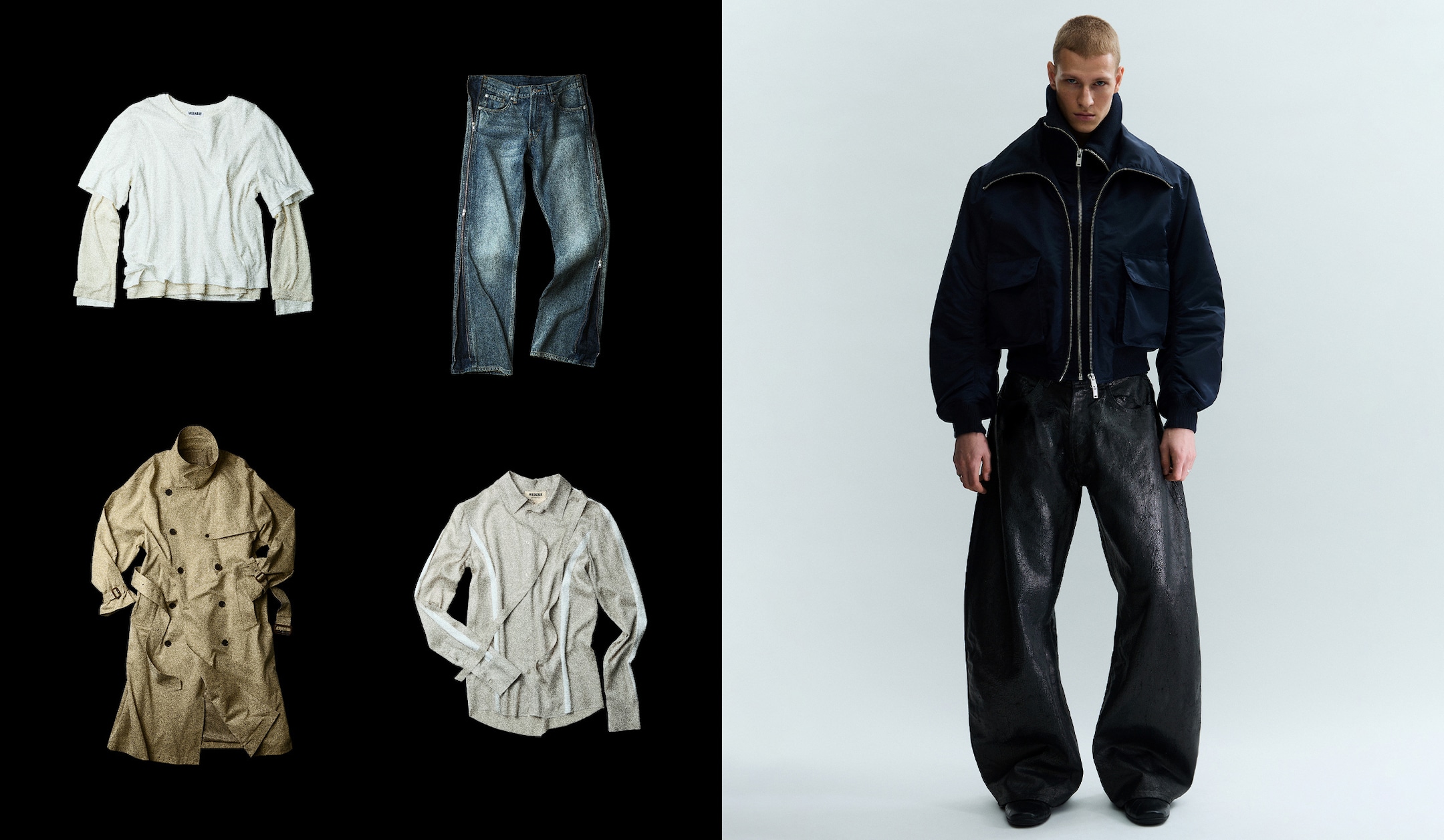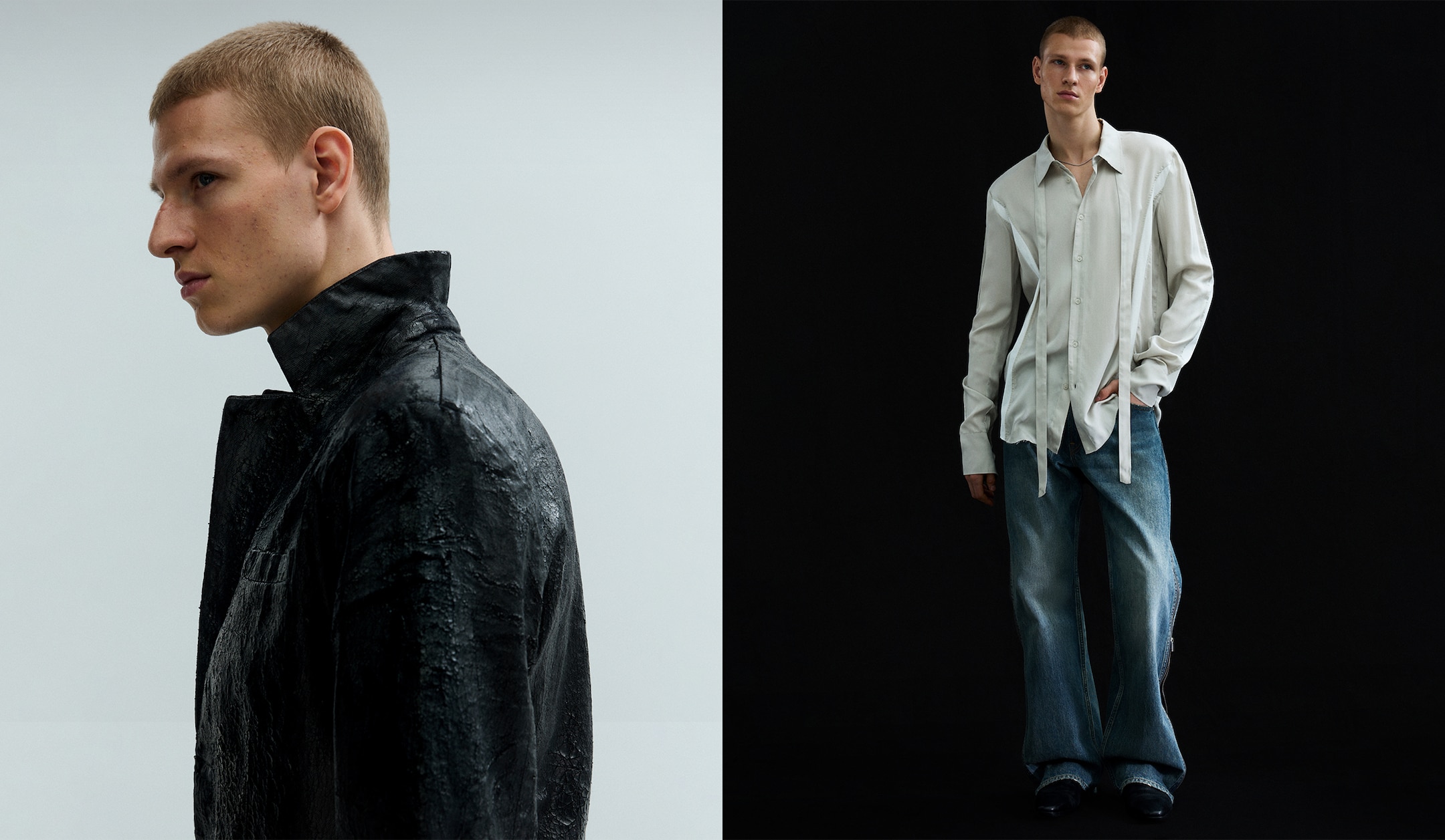 Meet our limited-edition menswear capsule; a collection of modern, accessible essentials designed to elevate your everyday wardrobe. These pieces blend clean silhouettes with contemporary detailing, for statement garments with built in personality. The outerwear selection stands out with a cracked leather blazer, a smooth leather coat, a double collared bomber jacket and an oversized trench coat. All crafted with intention to bring structure, texture and edge to your spring outfits. Subtle yet experimental detailing runs through the collection: bootcut jeans with zippers down the leg, a long sleeve T shirt built with four layers, a shirt with scarf details, and a heavy knit sweater boasting zippers from neck to the cuffs. In the trouser lineup you’ll find straight leg leather pants, barrel fit jeans with a cracked coating and wide suit trousers, all easily paired with the graphic print tee for a complete menswear look. Add a new statement piece to your spring outfit, or get a full look to push your expression to new heights.
